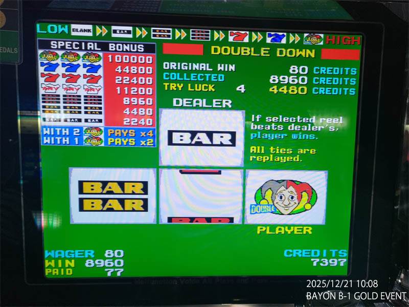 その後暫く回してJOKER引きで一気に振り切ってクレジット15000となり配当12倍が確定。