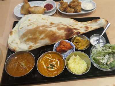 奥に写っているサイドメニューはサモサ(2個500円)とチキンパコラ(6個520円)です。 半分ずつシェアして食べました。