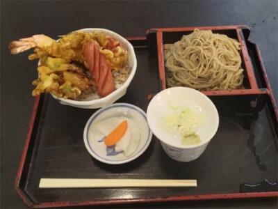 天丼はハーフサイズかき揚げ、エビ、赤ピーマン、ウインナーと4品。