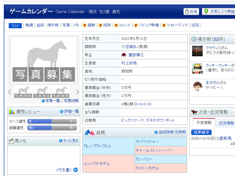 東京6R新馬線にダビスタを作った薗部博之さん所有の「ゲームカレンダー」という馬が出走していたので試しに単勝100円勝ったら当たりました。