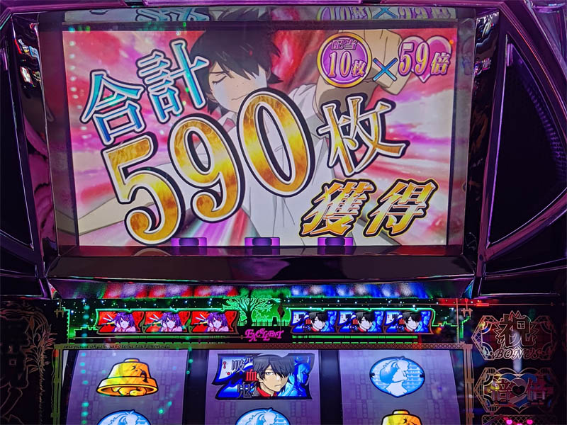 パチスロ転用機の化物語では倍々チャンスで590枚獲得。