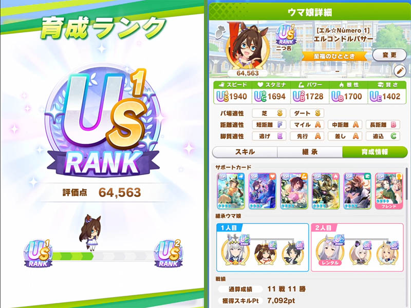 通常育成は評価値育成が楽しい。 温泉シナリオで試行錯誤した結果、育成ランクUS1まで行きました。