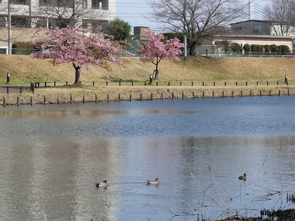 手前の咲いていない木は別品種の桜で3月になると咲きます。