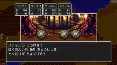 序盤の「カザーブ東ばくだんいわ狩り」で経験値稼ぎの図。