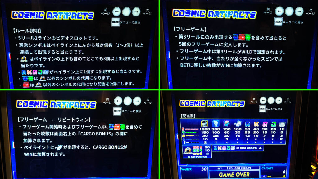 COSMIC ARTIFACTSはメダル残高の都合で遊びませんでしたが、リピートゲーム付きの1ラインスロットなのでsigmaのSUMMER VACATIONみたいな感じでしょう。