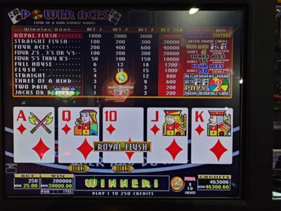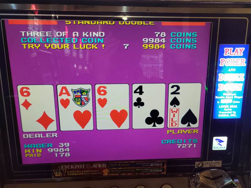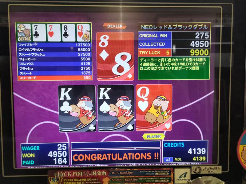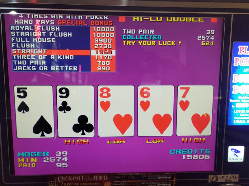 最大4勝で終了のダブルゲームで、引いたカードが左上に残り、ポーカーの役が出来ると追加配当がもらえるというもの。