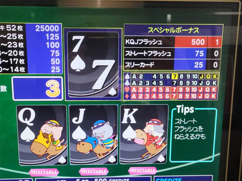 sigmaハイローのように、2勝目、3勝目で役完成が見込めない場合はコレクトという戦略もありますし、4勝で強制終了なので他のダブルよりメダルの減りが緩やかになりつつ、スペボで高配当も狙えます。