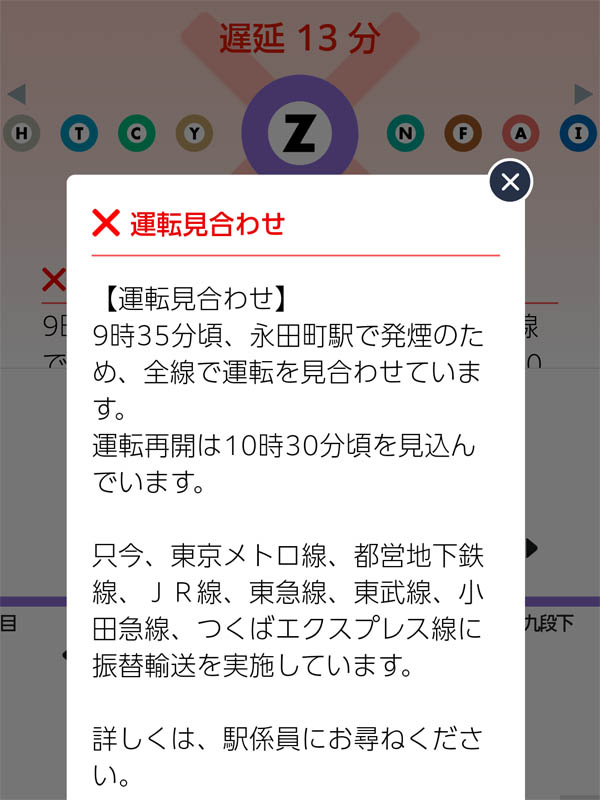 9時35分に半蔵モン線大手町到着で運転見合わせギリギリ回避して10時35分バ着。
