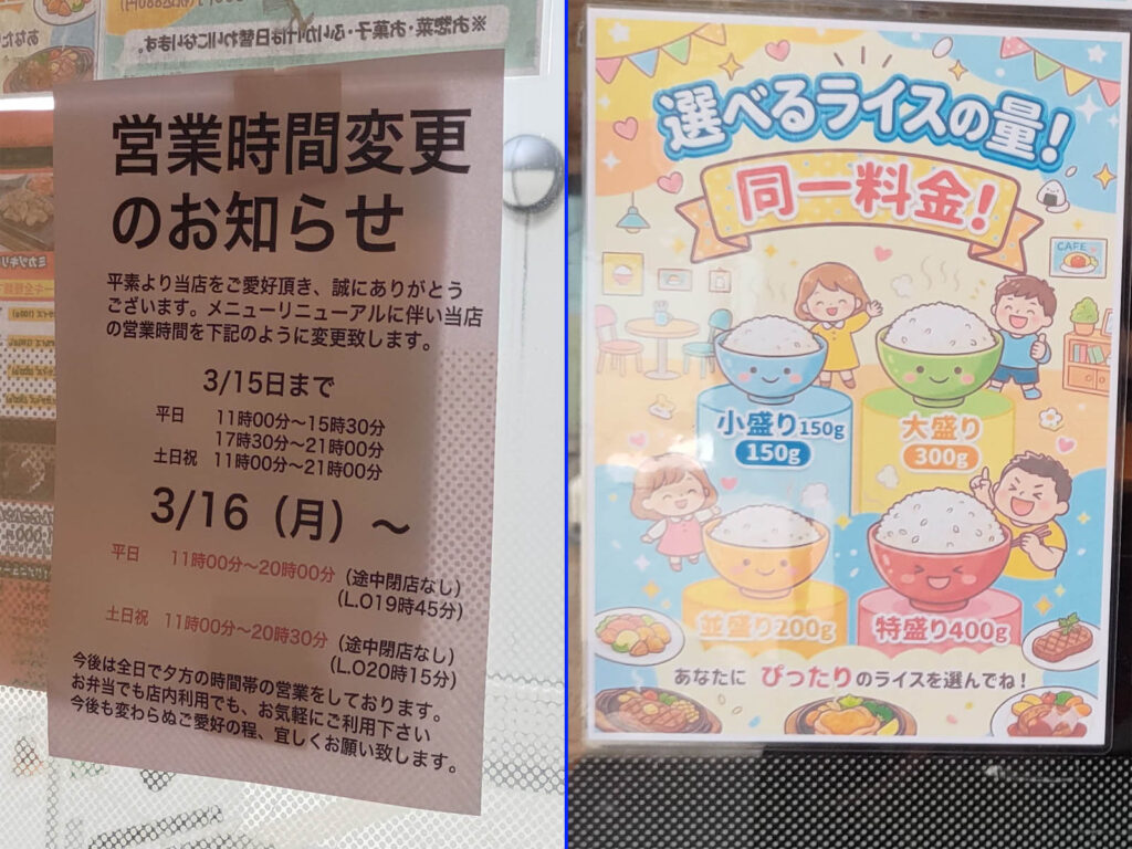 営業時間変更のお知らせとメニュー変更があり、システムも変更となっています。